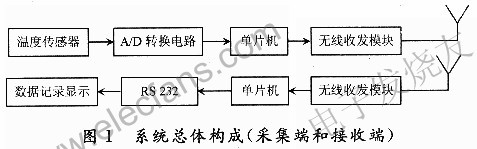 图2所示是系统的硬件组成,DSl8820是DALLAS公司生产的一线式数字温度传感器,可把温度信号直接转换成串行数字信号供微机处理。具有3引脚TO-92小体积封装形式;温度测量范围为-55~+125℃,可编程为9~12 b A/D转换精度,测温分辨率可达O.0625℃,被测温度用符号扩展的16b数字量方式串行输出;其工作电源既可在远端引入,也可采用寄生电源方式产生;多个DSl8820可以并联到3根或2根线上,CPU只需1根端口线就能与诸多DS18B20通信,占用微处理器的端口较少,可节省大量的引线和逻辑电路。从DSl820读出的信息或写入DSl820的信息,仅需要1根口线(单线接口)。读写及温度变换功率来源于数据总线,总线本身也可以向所挂接的DS1820供电,而无需额外电源。以上特点使DSl8B20非常适用于远距离多点温度检测系统。DSl820提供九位温度读数,构成多点温度检测系统而无需任何外围硬件,DSl820与nRF24E1的连接方式如图3所示。