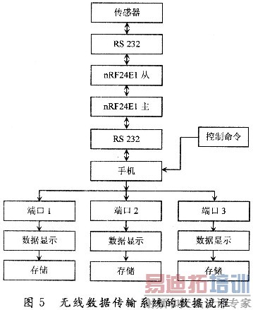 在本系统中,传感器采集数据后,送到下位机,下位机和上位机通过无线数据通道联系。无线数据收发部分主要由nRF24E1芯片、E2PR-OM、晶振、传感器信号输入和天线组成。