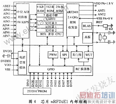 nRF24E1芯片是无线数据收发部分的核心,通过内嵌的51单片机内核,控制芯片内的A/D转换模块,无线收,发模块。将射频发射、接收、GMSK调制、解调、增强型8051内核、9输入12b ADC、125频道、UART、SPI、PWM、RTC、WDT全部集成到单芯片中,从而实现数据的采集,传输,处理等功能。硬件模块如图4所示,芯片主要由以下部分组成:
