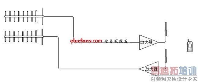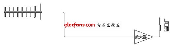 但是,上述只是一种比较极端的情况,更多的场合是没有这么好的条件的,往往需要在十米二十米以外才能找到强信号,这时,用这种简单的方法就不能奏效了。因为在900MHz频段,电缆的损耗是比较大的,而小天线与手机之间的信号传输也有不小的衰减量,这样高增益天线和手机之间无法实现有效地传输,当然也就无法通信了。解决的办法是在传输途径中插入放大器来弥补传输损耗,如下图所示。