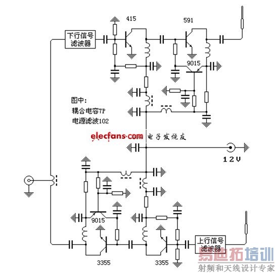 最简单的实用型手机放大器结构如上图所示,由两个选频放大器构成,一个放大上行信号,增益20分贝以上;另一个放大下行信号,增益不低于25分贝,电原理图如下。