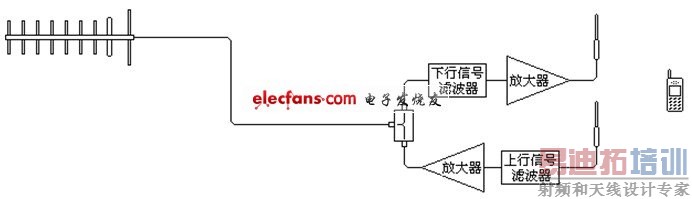 不要指望用两支室外天线、两个室内天线、两个放大器组成上图的系统就能工作,实际上是行不通的。因为两个放大器都有二十几分贝的增益,而两个放大器等效于通过10-30米的射频同轴电缆、两对天线之间的耦合而首尾相接,两个放大器的总增益在五十分倍以上,大大超过无形通路之间的传输损耗,必然自激,不可能工作。所以,放大器一定要具有很好的选频特性,即上行信号放大器只允许上行信号通过,而下行信号放大器只允许下行信号通过,这样,系统就可以稳定地工作了。