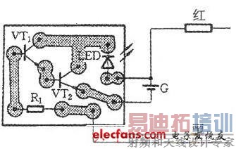 VT1可用9014型等硅NPN三极管,要求B≥200,VT2可用9013型等硅NPN三极管,B≥100,两管均要求穿透电流愈小愈好。LED用红色发光二极管,若能使用高亮度发光二极管则更好。