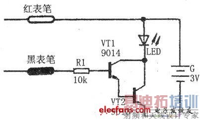 下图中三极管VT1、VT2组成达林顿复合放大管,它有极高的放大倍数。当测试器的红、黑两表笔接触小电容器两端时,就有一充电电流流经待测电容器,此充电电流虽然很微小,但经高放大倍数的达林顿管VT1、VT2放大后足能驱动发光管LED点亮发光。若LED不发光,表示电容器无充电能力,说明内部断线损坏。