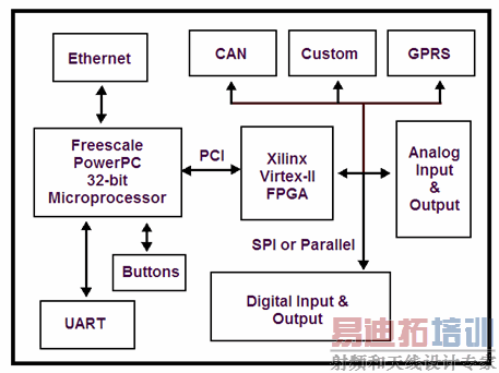 NI CompactRIO集成式嵌入式系统架构与图1所示的简单的方框图极为相似。它使用了Freescale公司的PowerPC微处理器并运行VxWorks实时操作系统。PowerPC通过内部的PCI总线与Xilinx FPGA相连接。此外,FPGA直接连接至各种模拟和数字I/O模块的连接头,从而使得您可以连接传感器、激励器、以及通信总线。如果您需要高度自定义的I/O,那么您可以设计您自定义的模块。图2示出了NI CompactRIO集成式嵌入式系统示意图,而图3示出了嵌入式系统方框图。