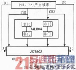 74LS04是一个六路反相器,对PCI1721板卡输出的脉冲波形进行两次反相,波形由模拟脉冲信号变成数字脉冲信号,使得PCI1721输出的脉冲波形上升沿和下降沿变的陡峭,基本上达到了实际中的要求。AD7502是一个八输入选择器,选择从PCI1721板卡输出脉冲信号或视频信号、检波信号等。从PCI1721板卡一个通道输出的波形一路经过两个非门后接到选择器,一路直接接到选择器,用程序控制PCI1721板卡数字输出D0和D1,将D0和D1分别接到选择器的地址端A0和A1,如果当前该通道输出信号是数字脉冲,则选择器选择输出经过两个非门后的一路信号;如果输出的信号是模拟信号,则选择器选择输出直接接到选择器的一路信号。
