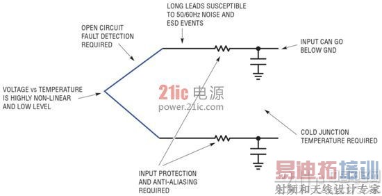 当热电偶尖头裸露于低于冷接点温度的温度时,热电偶的输出电压还能够低于地。这迫使系统增加第二个负电源或者输入电平移位电路,因此使系统变得更加复杂了。LTC2983 纳入了一个专有前端,能够用以地为基准的单一电源对信号进行数字化。