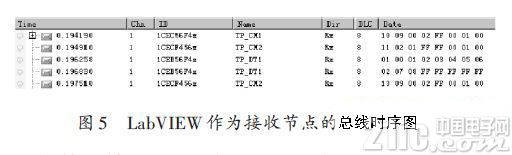 定义电池管理系统BMS和LabVIEW的J1939协议地址分别为244和86.首先由BMS发送PGN为256的9 B报文给LabVIEW,CANoe监视到总线时序如图5所示。