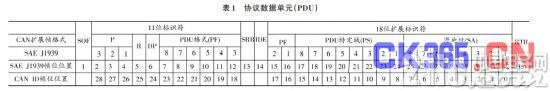 J1939 将CAN 2.0B 的29 位标识符ID 划分为六部分,每部分都代表不同的含义,包括优先级(P)、保留位(R)、数据页(DP)、PDU格式(PF)、特定PDU(PS)、源地址(SA),见表1.