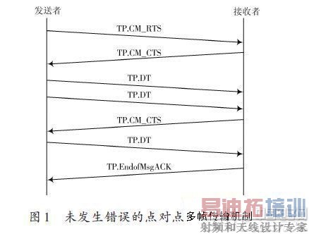 CAN 2.0B 数据域最多有8 B,而在J1939协议中当一个参数组编号(PGN)所对应的数据超过8 B时,规定了一种多帧传输机制,发送者按此机制拆分发送,接收者按此机制接收重组,因此一个参数组编号所对应的数据最多可以为1 785 B.点对点未发生错误的多帧传输机制如图1 所示,J1939 对传输过程出现错误的情况也规定了相应的处理机制,在此不作介绍。