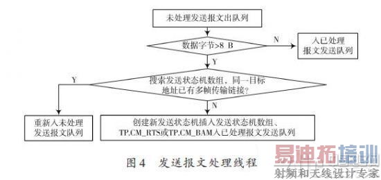 发送报文均先入未拆分发送报文队列;创建未拆分发送报文处理线程,用于按多帧传输机制处理发送报文,程序流程图如图4所示,若发送报文数据超过8 B则需要通过多帧传输机制拆分发送。