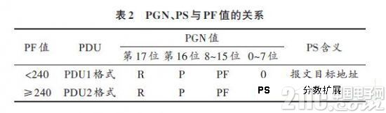 根据CAN 2.0 总线的仲裁机制,标识符值越小,CAN帧优先级越高,J1939把这一权利赋予了标识符最高三位(P)。R、DP通常为0.SA代表了该帧数据的发送节点的地址,CAN 网络中每个设备都分配了惟一的SA.在介绍PF 与PS之前有必要先介绍下参数组编号(PGN)的概念。每个PGN代表着惟一的参数组(可以包含一个或多个参数),当参数组的数据域大于8 B时,需要遵循J1939的多帧传输机制。PGN 由R、DP、PF 以及PS 组成,见表2.从表2 中可以看出PDU2 格式报文没有目标地址,此类报文只能发送给全局地址。由于PS作为PDU2 格式参数组编号的一部分,因此PDU2 比PDU1能定义更多的参数组编号。