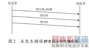 这个过程循环进行,直至接收者接收到全部数据包后发送消息结束应答帧TP.EndofMsgACK代表着这次多帧传输的结束。若发送的消息是全局消息,则所有接收者不应有任何应答,整个传输过程如图2所示。