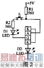 可控硅检测电路如图2所示,先用万用表检测出被测可控硅的A、G、K极,再将被测可控硅的A、G、K三个引脚插入对应的插孔中,接通电源,不按按钮开关S时,发光二极管D2不发光,按一下按钮开关S时,若发光二极管D2能持续发光,则被测可控硅是好的。