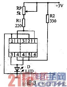 光电耦合器检测电路如图3所示,可将TLP621等四个引脚的光电耦合器插入插座左端的四个引脚的插孔中,将TLP332等六个引脚的光电耦合器插入插座右端的六个引脚的插孔中。接通电源后,电源经RP、R1给IC中的发光二极管提供一个正向电压,发光二极管发光,使IC中的光电三极管导通,3脚外接的发光二极管D发光,若调节RP时,发光二极管的亮度能跟着变化,则被测光电耦合器是好的。