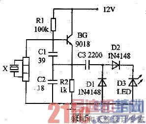 石英晶振检测电路如图5所示,BG与C1、C2、石英晶振X等组成高频振荡电路,C3、D1和D2组成二倍压整流电路。将被测石英晶振插入插孔中,接通电源后,若发光二极管D3能持续发光,则被测石英晶振是好的。