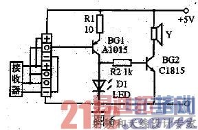 红外线遥控接收器和红外线遥控发射器的检测电路如图6所示。图中Y是直径为1cm,高为1cm左右的圆柱形小体积蜂鸣器,插孔的标号“+”、“-”表示遥控接收器的电源端,“o”表示遥控接收器的信号输出端。若检测一体化的三端红外线遥控接收器,将被测遥控接收器的3只引脚插入对应的插孔中,接通电源,用一只好的红外线遥控发射器对着遥控接收器,按住遥控发射器的任意按键时,若D1能闪烁发光,同时蜂鸣器Y发声,则被测红外线遥控接收器是好的。若要检测红外线遥控发射器的好坏,要将一只好的红外线遥控接收器插入插座中,按下被测红外线发射器的任何按键时,发光二极管D1都能闪烁发光,同时蜂鸣器发声,则被测红外线遥控发射器是好的。