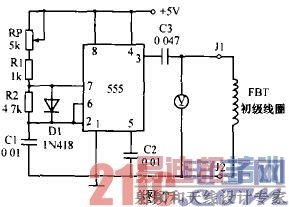 行输出变压器检测电路如图7所示,555集成定时器与外接元件构成多谐振荡器。调节RP可产生12.5~25kHz的方波脉冲,由3脚经C3耦合输出作为FBT初级线圈电谐振的激励脉冲,C3与FBT初级线圈组成一串联谐振电路。