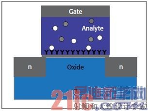 BioFET半导体换能器的制作过程如下。介质层是氧化物,如二氧化硅,它有两项任务。第一项任务是将FET沟道与液体进行隔离,第二项任务是将表面电荷静电耦合至沟道。在介质层上面是生物功能层, 它起到固定生物分子接受器的作用,能够结合期望的分子。分析物是包含溶解的样本分子的解决方案。参考电极允许调整器件,从而实现其灵敏度最大化。如果目标分子与接受器结合,那么表面电荷密度将发生变化。这种变化将改变半导体电势以及FET沟道连通性[2]。