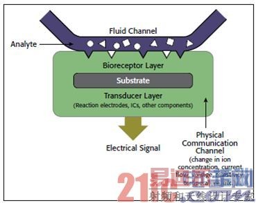 更具体地说,生物传感器包括生物识别元件,由它来识别目标分析物。生物传感器的换能器将识别事件转换为与感兴趣的化学或生物目标的数量或存在相关的可测量信号。图1给出常见的生物传感器模型。