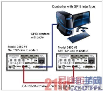 对于计算机与2450型仪器的GPIB通信,只需要1根电缆,实现GPIB接口与2450型仪器IEEE-488接口的连接(图8中2450型#1)。将2450型#1的TSP-Link节点设为节点1,将2450型#2的TSP-Link节点设为节点2。