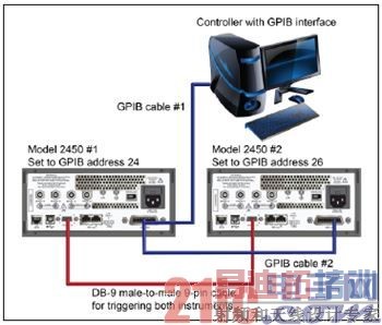 上图还给出利用GPIB程控通信接口实现的通信连接。利用GPIB电缆(#1)实现计算机(控制器)GPIB端口与2450型仪器(#1)后面板IEEE-488插孔的连接。利用GPIB电缆(#2)实现两部2450型仪器IEEE-488插孔之间的连接。