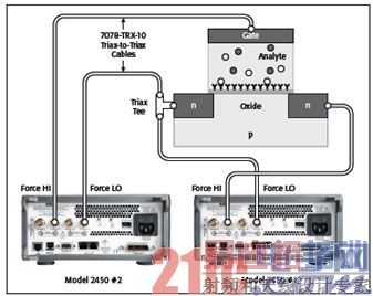 在这个例子中,使用4根三轴电缆(7078-TRX-10型),实现2450型仪器后面板母三轴插孔与BioFET器件的互连,它被安装在一个金属屏蔽的测试夹具内,与母三轴插孔连接。利用三轴三通(237-TRX-T型)实现两部2450型仪器的Force LO端与BioFET源端连接。