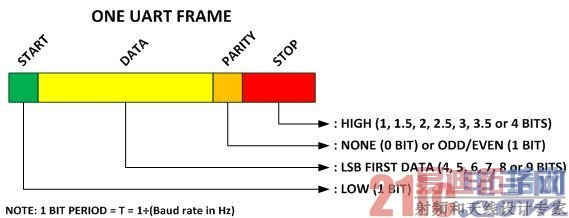 图1给出一个标准的UART帧,并解释了其中的所有字段。该帧的定义是在考虑了市场上不同的UART规范后而制定的。因此可以肯定地说,以下结构覆盖了所有可能的UART数据帧组合。