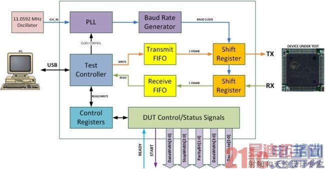 待发送的数据包已被转换为帧比特并送入FIFO。帧数据被加载到发送移位寄存器中,并以正确的波特率发送到DUT。采用类似的方案从DUT接收数据包。对接收到的帧以双倍波特率(或更多)进行采样,一旦整个数据包进入接收移位寄存器中,帧比特位就会被转移到接收FIFO中。