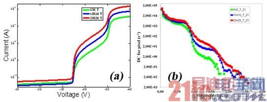 该多片方案内的光电检测器全都具有光电特性[9]。我们的目标是确定最佳的信噪比[10],测量了该器件的反向电流-电压 (I-V)特性和暗计数数量(DC),即在无光照条件下由被检测到的热生成载波引发的雪崩(计数)。图3a所示是5×5 (绿线)、10×10 (蓝线)、20×20 (红线)像素点阵有沟槽光电检测器在室温条件下的典型反向I-V特性。图3b所示是暗计数测量结果,暗计数测量就是对硅光电倍增管施加-30V偏压,然后通过归一化计算取得的像素数量。通过直接比较不同阵列,我们发现两个明显的主要特性:所有测试条件中击穿电压(BV)相同,如果像素数量增加,则器件噪声(暗电流和暗计数)随之提高[8]。BV (-28V)和 -35 V区间是Geiger模式工作的目标范围。在这个区间,暗电流随着像素数量增加而线性提高,这种现象在图3b第一个区间 (0.5 #p.e.)更为明显 。