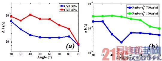 图4(a) 30% CY5溶液(蓝线)和40% CY5溶液(红线) 在20°- 90°位置的荧光特性; (b) 700μg/ml Ru(bpy)32+ (绿线)溶液在20°- 90°位置的荧光特性