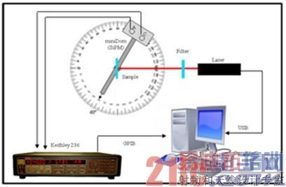 硅光电倍增管设为连续工作模式,并连至Keithley 236源测量仪,将硅光电倍增管置于角度计上,以便让操作人员能够观察不同发射角的荧光信号。样本置于激光二极管的同一光轴上,光线正常照射样本表面。将硅光电倍增管用作光子计数器,使用脉冲工作模式检测非常微弱的荧光信号。用安捷伦脉冲发生器Agilent 81110A驱动激光二极管取得的脉冲激光波形(周期10ms,波长4 ns)测量CY5样本发射的光子。在这种情况下,同样让激光正常照射置于同一光轴上的样本,将硅光电倍增管与激光二极管置于同一平面上,且与激光管光轴的夹角为60°,用硅光电倍增管检测样本发射的荧光。该指定角度可确保被检测到的光噪声 (玻片反射的激光) 最低。向硅光电倍增管施加-30V或 -32V偏压。若需要更高的信号强度,则施加更高的偏压。用示波仪(Tektronix DPO7104)记录检测到的信号,通过专门开发的Labview软件采集信号,在PC机上使用Matlab软件对信号进行后分析。