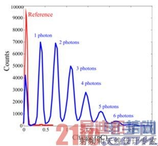 图5:CY5荧光光子计数分布(蓝线),噪声(红线)