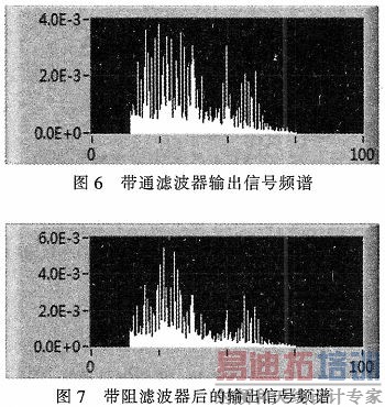 图6和图7是用Labview对所测信号进行分段分析得到的频谱,其中横坐标是频率(单位:Hz),纵坐标是电位幅值(单位:V),采用科学计数法。带通滤波器的的中心频率约为