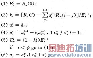 上面各式中括号内的上标表示预测器的除数。步骤(1)~(4)可对I=1,2,…,P进行递推求解,其中:E为最小均方预测误差,R为自相关系数,k表示反射系数,取值范围为[-1,1],aij表示i阶预测器的第j个系数。通过运算发现,其实在计算过程中,虽然目标是计算一个p阶线性预测器的全部系数,但实际上在递推过程中仅算出了所有除数低于p阶线性预测器的全部系数,同时计算出了最小预测误差能量(递推式中反射系数的取值范围是保证系统H(z)稳定性的充分必要条件,即多项式A(z)的全部根都落在单位圆内)。