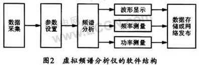 组建好的各功能模块按照程序的流程加上必要的控件和指示器,就可以形成一个功能完善的虚拟信号频谱分析仪系统,图3给出了这个虚拟信号频谱分析仪的程序图。