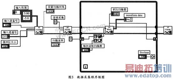 图3是使用中级模入设计的数据采集程序框图。先用Device Open.vi模块打开数据采集设备,然后用AI Config.vi模块配置数据采集卡,选择模拟量输入通道,并指定输入信号的范围来调节硬件增益,同时设置采集数据所占用计算机缓冲区的大小及设置扫描间隔,再通过AI Start.vi启动模入操作,主要用于控制数据采集速率和要获得的扫描数,这里将Number of scans to acquire (获得的扫描数)输入端口值设置为“0”,即选择连续采集模式,直到清除模入操作为止(如果设置为“-1,’则只要缓冲区满就停止扫描),然后通过AI Read.vi从AI Config分配的缓冲中读取数据,它能控制每次读取的点数、读取数据在缓冲中的位置等,输出是一个二维数组,每一列数据对应于通道列表中的一个通道,最后通过AI Clear.vi模块清除模人操作、清除计算机中分配的缓冲及释放所有数据采集的资源。