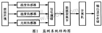 烟田生态环境系统的构建方案采用PC-DAQ(基于计算机的数据采集卡)系统,由传感器、信号调理装置、数据采集卡和执行机构等设备组成。