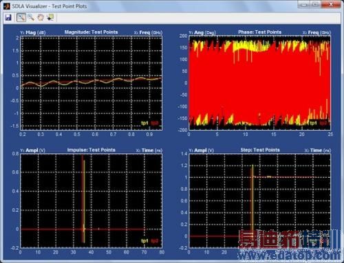 图11显示了上述每个S参数向量的时域脉冲响应表示。这也是一个很有用的视图,因为它能容易地显示传输项的时延。它还会显示数据是否是在该时间间隔内建立的,因为非如此不能保证S参数集的有效性。这些曲线是通过计算频域S参数数据IFFT(快速傅里叶逆变换)而得到的。这常常需要把频域数据外推至DC,有时需要外推至更高的理想Nyquist频率。