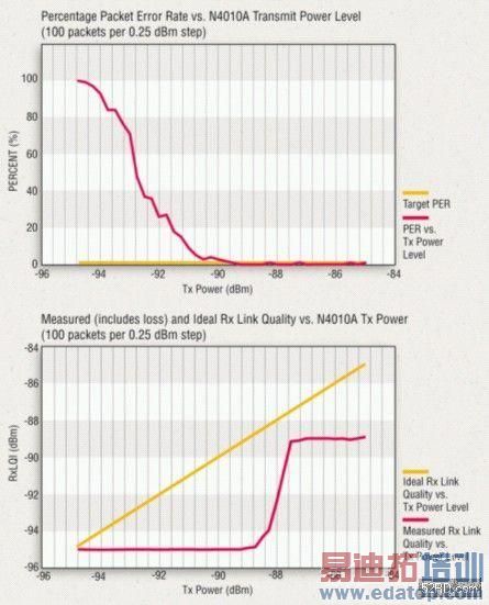 经由控制N4010A任意波形产生器,可执行ZigBee设备的接收器测试。以接收器的灵敏度为例,在这项测试中,N4010A内建的任意波形产生器可用 来将封包传送到DUT,并且降低功率位准直到达到错误标准。以下图表是使用Agilent VEE来控制设备和仪器,以执行接收器灵敏度和链路品质测试的结果。