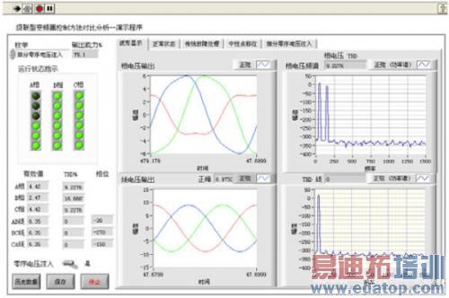基于PCI-9846的变频器输出性能测试系统,利用LabVIEW虚拟仪器软件平台搭建系统主控界面,设计了相应的故障处理方法,可以得到不同故障处理方法时的参考波。在多单元级联型变频器仿真模型上进行测试,通过凌华PCI-9846数字化仪采集三相电压信号后进行分析处理,获得三相线电压的幅值,频率,总谐波含量,三相电压相位等主要性能指标,从而检查控制算法在系统正常运行及带故障运行时的输出情况。