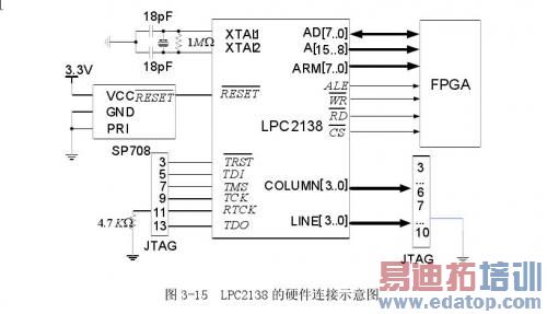 JTAG接口电路采用ARM公司提出的标准20脚JTAG仿真调试接口,JTAG信号的定义及与LPC2138的连接电路如图3-15所示。LPC2138支持通过JTAG串行端口进行仿真和调试。跟踪端口允许跟踪程序的执行。调试和跟踪功能只在GPIO的P1口复用。这意味着当应用在嵌入式系统内运行时,位于P0口的所有通信、定时器和接口外设在开发和调试阶段都可用。同时,ARM的P1.16~P1.23口通过连接JTAG插座,外接控制键盘。
