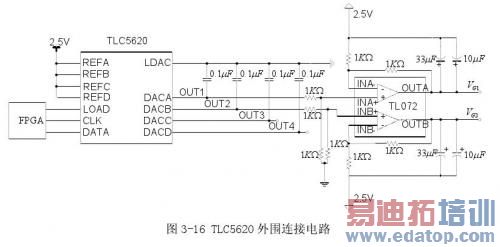 本设计中,TLC5620的外围连接电路如图3-16所示。图中,REFA~REFD为参考电压输入端,这里均接到一个稳定的2.5V电源上。TLC5620输出信号(DACA~DACD)的电压范围可编程选择为参考电压的一倍或两倍。LOAD、CLK、DATA为TLC5620的串行总线接口,通过这三根总线可对TLC5620编程实现数字控制。本设计中这三根总线与FPGA相连,实现由FPGA控制TLC5620相应通道的输出电压。