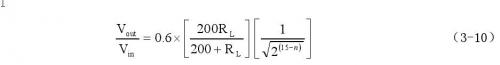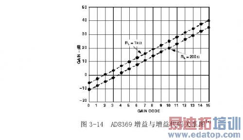 式中RL是外接负载电阻,单位是欧姆;n是增益控制代码,最小是0,最大是15.由图3-14可知,当增益控制代码不变时,负载RL增大,则芯片的增益提高;当负载电阻一定时,在整个45 dB增益调节范围内,AD8369的增益与增益控制代码之间都能保持良好的,以分贝为单位的,3dB步进的线性关系。