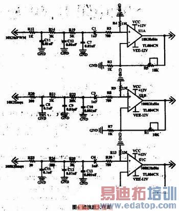 根据需要取截正频率为1kHz、10kHz、100kHz的低通无源滤波器,将单片机输出的PWM或方波(因为MSP430该单片机不能输出太大频率的PWM,我们通过直接输出10kHz和10kHz的方波,通过一个低通滤波器,滤掉二次谐波及以上分量,得到其基波分量)整形为正弦波,用继电器切换不同的滤波器,来获取不同信号,每一个频点滤波后接一级运放;放大到相同幅度,为了能满足放大100kHz的信号的增益带宽积和压摆率,运放采用TL084。通过测试发现,无源滤波电阻采用逐级增大,电容采用逐级减小,滤波效果最好,所以通过仿真得到参数如图4所示的滤波放大电路图。