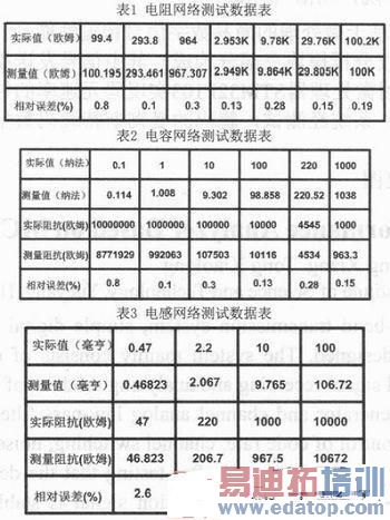电路设计完成后,本文给出了三组实验测试数据,分别为表1、表2和表3所示,其中表1为电阻网络测试数据,表2为电容网络测试数,表3为电感网络测试数据。实验数据表明,除了电感测量误差相对较大之外,其它的测量能够较准确地反映待测元器件的属性以及大小,可以满足一般的实际需求。