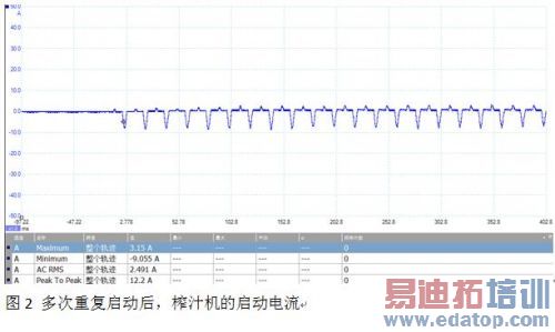 但是在我们重复启动测试时却发现总是无法采集到启动脉冲。什么原因呢?经过多次验证之后发现,原来榨汁机在第一次启动时确实有一个很高的启动脉冲,但是在连续多次重复启动之后,机器处于预热状态,启动时就没有瞬时的突变电流脉冲(客户之前并没有意识到这个问题)。适当的减小触发阈值可测试到较平稳的启动波形。如图2所示。