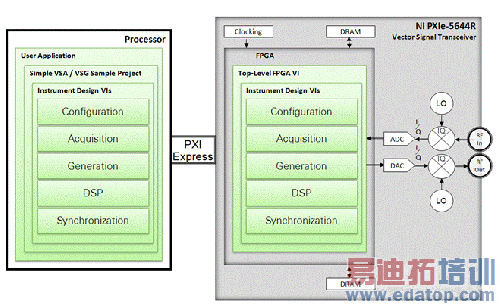 图2. NI PXIe-5644R矢量信号收发器的架构可允许在主机或设备固件中仿真和部署用户可编辑的DSP块。同时也可以对其他输入/输出以及内存接口进行修改以作为算法设计的补充。