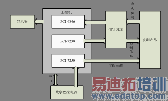根据电子时间引信的工作特点和自动化、通用化的使用要求,虚拟仪器技术十分符合方案要求,并且能够较好地达到方案预期的效果。凌华科技公司有着丰富的虚拟仪器测试测量产品线,可以给我们提供较大的选择空间,LabVIEW是一种易学易用的开发软件,可以利用它快速、简便地开发出复杂、并行、有效并且易于操作的测试系统。为了降低系统的成本,我们决定选择选用工控机加PCI板卡的方式,并通过扩展USB端口、串口、及其它模块单元进行数据交互和测试,在LabVIEW软件平台下开发新的测试系统。总体方案设计如图1所示,其中:
