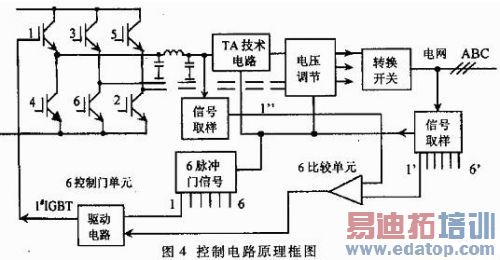 首先从电网侧同步取出可供逆变器工作的参考信号和同步信号,由此参考信号产生的三相六波头信号和由逆变器输出的带毛刺三相六波头信号进行比较,从而产生控制IGBT导通的控制信号。再经由六脉冲门信号控制的门电路,送到六个IGBT栅极,从而控制六个IGBT的通断,最后使逆变器输出和电网同频率、同相位(同步)的带毛刺正弦波。通过由电网参考信号控制的TA技术电路滤去毛刺(谐波),即得到和电网同频率、同相位的纯正弦电压。再经电压调节电路调整后,通过转换开关回馈给电网。